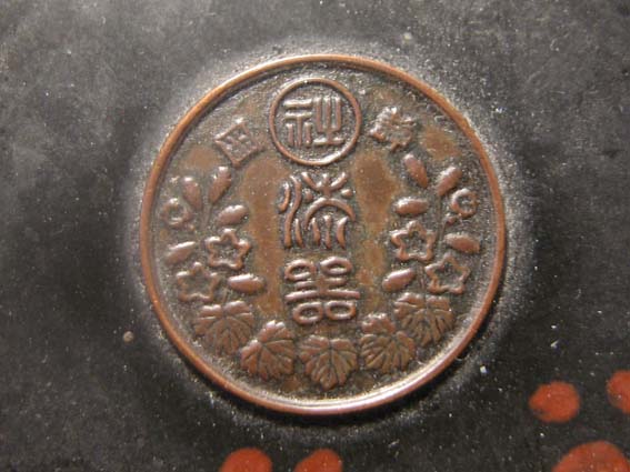 auf einem kürzlich erworbenen japanischen (?) Lackkästchen sind 3 Münzen eingelassen.