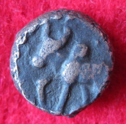 Ich habe hier eine kleine Bronze (10 mm; 2,11 gr.) die mich an Stücke der Nagas erinnert, allerdings fand ich dort kein Buckelrind in der hier gezeigten Stellung und auch die Schriftzeichen waren nicht ganz identisch. (Zeno habe ich schon durchgesehen). Vielleicht liege ich mit Nagas ja auch völlig falsch. Hättet Ihr eine Bestätigung oder einen Tipp?