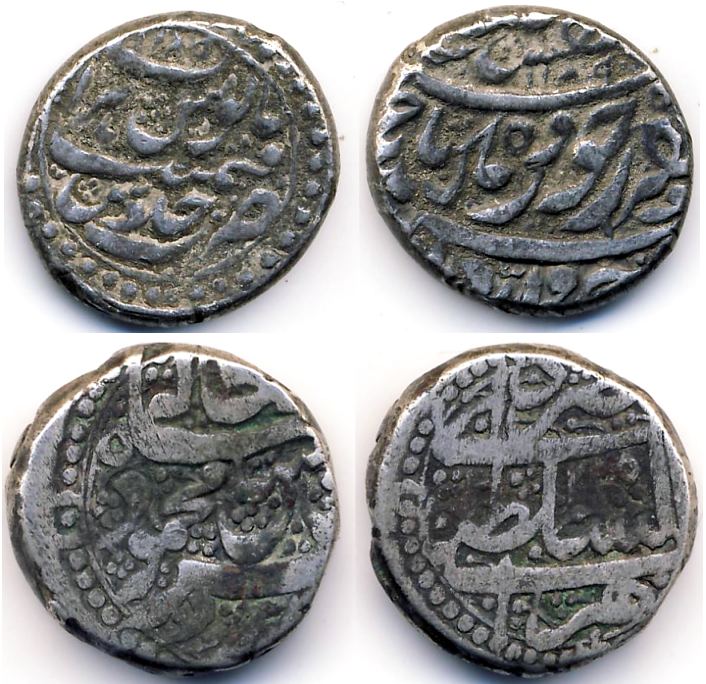 Shah Zaman aufgeführt, zeigt aber ein identisches Münzbild zum rechten Stück. Um die Verwirrung vollständig zu machen, zeigt das linke Stück, datiert mit 1211 AH (1796 /1797 AD), im Avers eine andere Legende und wird unter