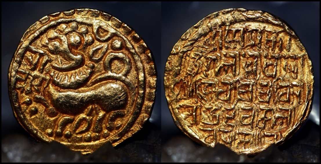 Das Stück, das ich hier vorstellen möchte, ist eigentlich eine 'besondere' Münze, denn sie wird zu den schönsten Geprägen des indischen Mittelalters gezählt. Aber da sie ohne ein wenig Geschichte 'stumm' bleibt, erscheint sie mir in 'Asien' besser untergebracht.