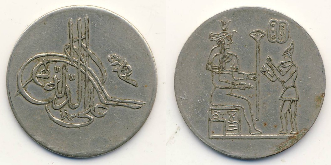 Es ist ein ägyptischer Token; da muss nicht unbedingt der Sultan aus Istanbul drauf sein. Unten meine ich Ali lesen zu können. Da käme Ali Bei in Frage. Dessen Tughra kann ich aber nirgends finden. |
