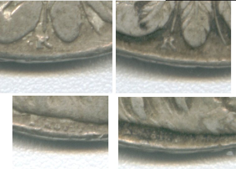 ...Eine gewisse Ähnlichkeit des R mit einem K läßt sich da zwar durchaus erkennen, aber der Designername ist zumindest auf dem linken Bild noch relativ gut zu erkennen. Bei der rechten Münze erkennt man am Original zumindest, daß sich dort Buchstaben befinden (oder irgendetwas ;) ), auch wenn ich es selbst mit der Lupe nicht lesen kann...