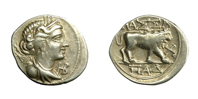 Rv. Löwe rechts, darüber MAΣΣA, rechts X, im Abschnitt ΠAΔ