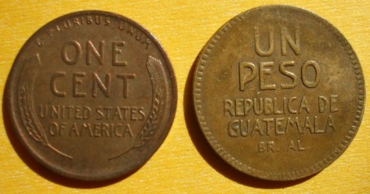 Hier unten, ist die Umkehrung der den 1925 Weizen Cent aus den USA, und Guatemala's 1923 1-Peso.