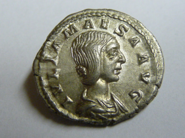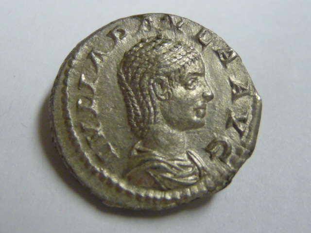 Von ihr dominiert ein einziger Rückseitentyp die gesamte Münzprägung, nämlich Venus Caelestis sitzend oder stehend. Dieser Typ macht 98% (geschätzt) ihrer Münzprägung aus. Dann gibt es noch die Antrittsausgabe, die ich hier vorstellen möchte. Alle anderen Typen sind Hybridprägungen oder antike Fälschungen (oder natürlich moderne...).