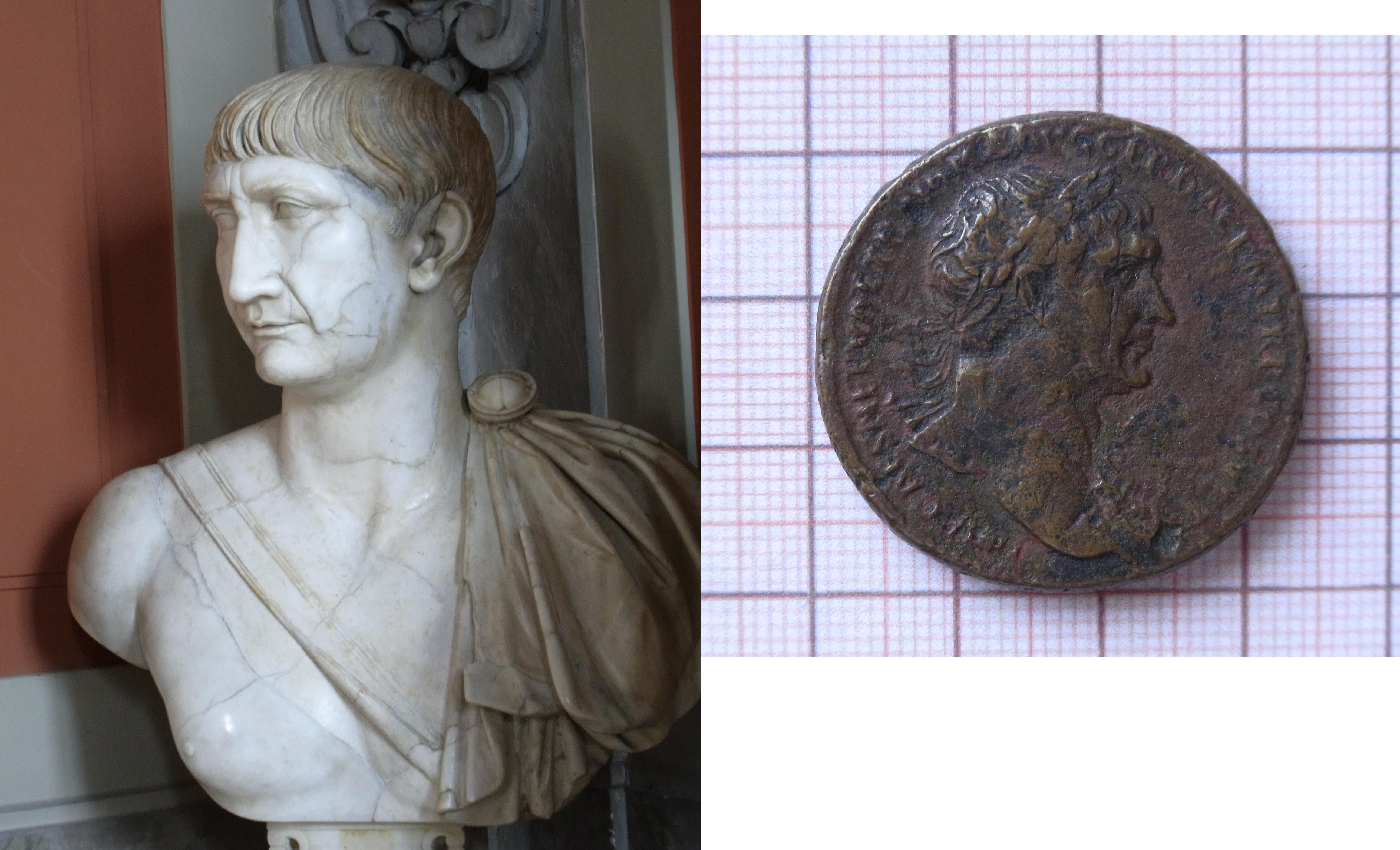 Würdevoll blickt ebenso im Vatikanischen Museum die Büste des Marcus Ulpius Traianus den Besucher an, während er auf diesem Sesterz fast martialische Gesichtszüge aufweist !