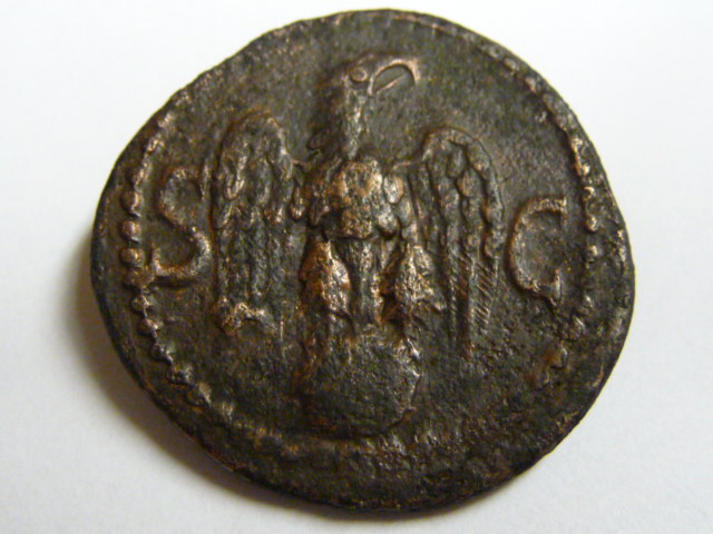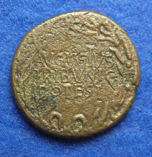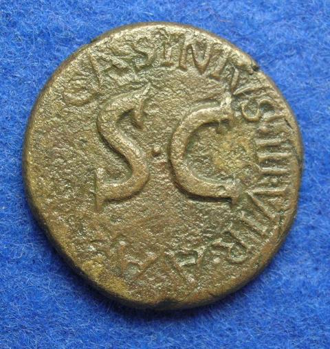 C. Asinius C.f. Gallus ist einer der häufigeren Münzmeister des Augustus. Auf den Sesterzen ist sein Name voll ausgeschrieben, auf den im RIC verzeichneten Dupondien und Assen fehlt das CF für Caii Filius. Da hier das ganze Wort GALLUS fehlt, vermutete ich zunächst eine zeitgenössische Imitation, zumal ein As dieses Typs im CBN aufgeführt ist. Aber mit der Münze in der Hand deutet wirklich nichts auf eine Barbarenprägung hin. Der Schrötling ist aus dem richtigen Metall, Größe, Dicke, Form und Gewicht stimmen, ebenso die Stempelorientierung. Die Buchstaben sind wie häufig etwas flach, aber v.a. auf der Vorderseite sehr gut geformt, auch mit dem charakteristischen überhöhten T in Augustus. Ich denke, hier haben wir es mit einer echten Variante aus Rom zu tun. Auch der Vorbesitzer meines RIC hat darin ein solches Stück eingetragen, aus einer Auktion "Sch 4.88" als Los 336. Dazu habe ich allerdings kein Bild.