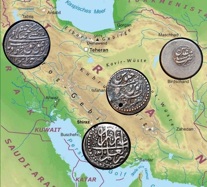 Kann man ein Jahrhundert Geschichte eines fremdartigen Landes - damals Persien, heute Iran - an vier Münzen festmachen? Man kann es immerhin versuchen. Die vier Münzen, die ich hier zeigen möchte, erfassen jedenfalls die vier Dynastien, die im 18. Jh. in Persien / Iran regierten. Die Qajar, die ins 19. Jh. hinein und dann bis ins 20. Jh. regierten, habe ich außen vor gelassen. Ein Blick auf die Karte ergibt für diese Dynastien bei den Regierungssitzen ein eigenartiges kopfständiges Dreieck: eine Linie führt von