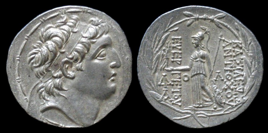 Seleukiden, ANTIOCHOS VII. EUERGETES. 138-129 BC. Seleucis et Pieria, Antiochia. Tetradrachme. Kopf mit Diadem r. Rs: Athena steht l. mit Speer, Schild und Nike. BASILEU ANTIOCHOU EUER-GETOU Alles in Lorbeerkranz. Monogramme. SMA 298. 16,6g, 30,05 mm.