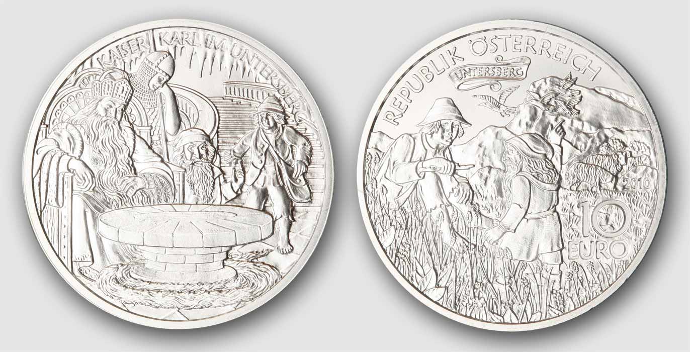 Die Serie „Sagen und Legenden in Österreich“ aus sechs 10-Euro-Silberstücken nahm im April des Vorjahres mit der Wiener Sage „Der Basilisk“ und der Geschichte von „Richard Löwenherz in Dürnstein“ ihren Anfang. Heuer erschien schon die Münze „Der Erzberg in der Steiermark“, der nun „Karl der Große im Untersberg“ folgt. 2011 ergänzen dann „Der Lindwurm in Klagenfurt“ sowie „Der liebe Augustin“ – wohl eine der berühmtesten Sagen Österreichs – die Reihe.