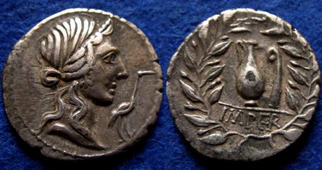 Die Münzen im Namen des Quintus Caecilius Metellus stammen aus der Zeit, als Rom bereits in Sullas Hand war, sich in Norditalien aber noch Truppen der Marianer hielten. Folgende Münze wurde in einer Heeresmünzstätte der sullanischen Armee unter Metellus´ Kommando im Jahr 81v. in Norditalien geprägt:
