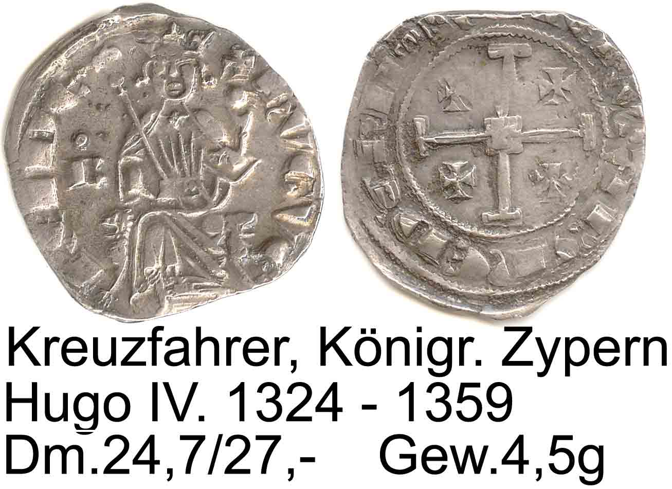 Hallo liebe MA Spezialisten, ich habe hier einen Grossus (Besant) von Hugo IV. 1324 - 1359 , Königreich Zypern Av: König v. vorne sitzt auf Thron mit Zepter u. Reichsapfel, im Feld links Beizeichen C Umschrift: HVGVE REIDE RV: Kruckenkreuz mit Tatzenkreuzen in den Winkeln, Umschrift: IERVSALMEDCHIJPRE Dm 25,9/26,6, Gew. 4,5g ich hoffe ich habe die Münze richtig bestimmt und bin für Ergänzungen und Korrekturen dankbar. Weiß jemand was das Beizeichen C bedeudet ? Auch bei der Umschrift bin ich mir nicht sicher. Gruß Franz