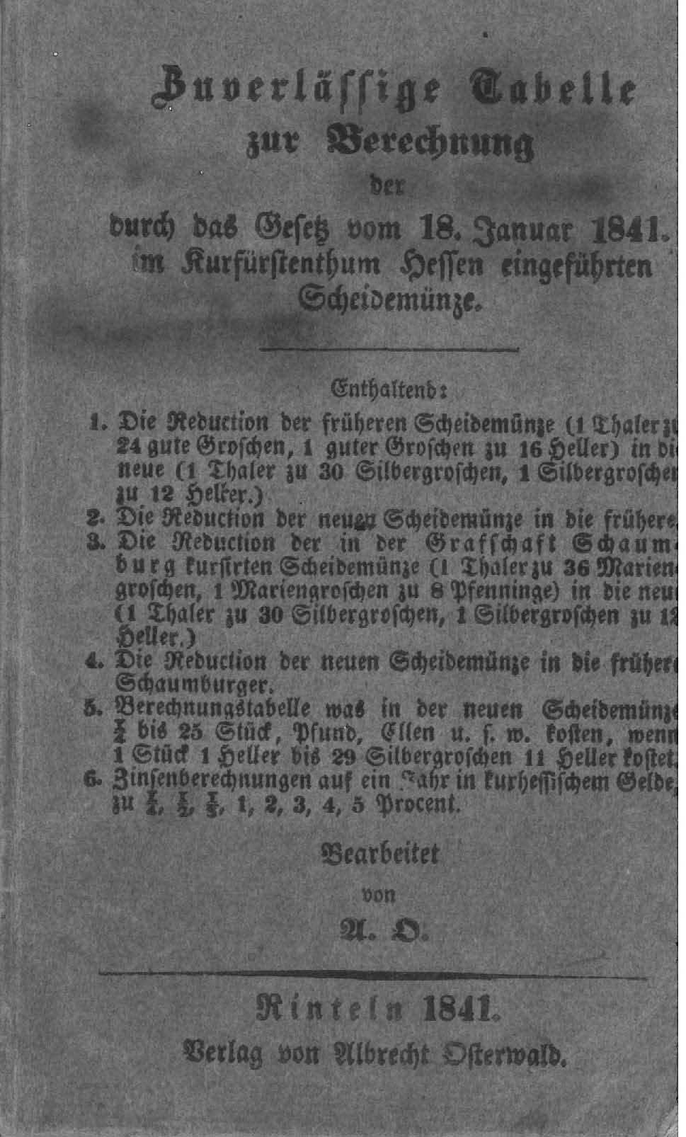 Heute war bei der Post ein kleines Büchlein, über das ich mich sehr gefreut habe. Es enthält Umrechungstabellen für die Umstellung des Talers zu 24 gute Groschen auf den Taler zu 30 Silbergroschen in Kurhessen. Diese wurde im Rahmen der Harmonisierung der deutschen Währungen erforderlich, wie wir das heute wohl ausdrücken würden. Eine schöne Parallele zur Euroumstellung.