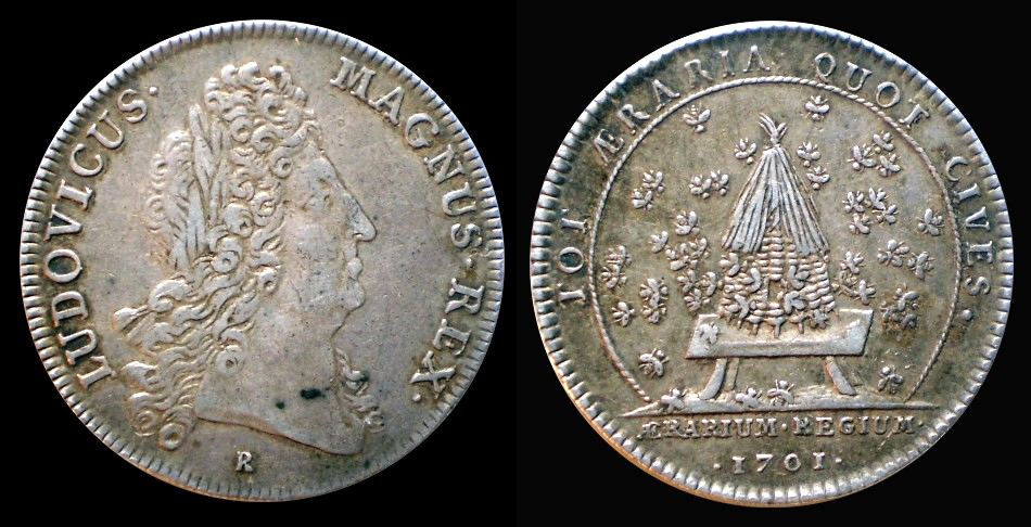 Jeton 1701 (von Roettiers, Ag, 28 mm) Av. Büste Louis XIV. nach r., Signatur R, LUDOVICUS. MAGNUS. REX. Rv. Bienenvolk umschwärmt einen Bienenkorb. TOT. AERARIA. QUOT. CIVES („Soviele Staatskassen wie es Bürger gibt“). Exergue AERARIUM. REGIUM. 1701 („Königliche Staatskasse“, Hrsg. des Jetons). Feuardent 1965.