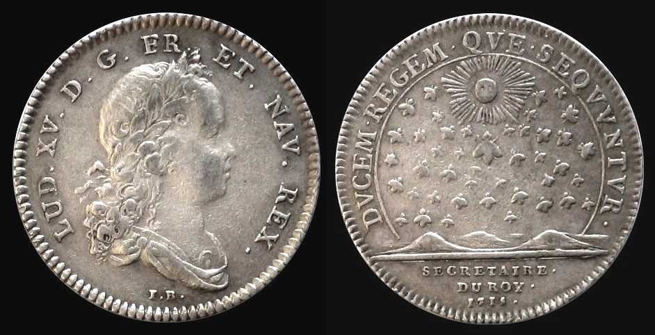 Der folgende Jeton nimmt Bezug auf den Regierungsantritt des minderjährigen Ludwig XV. am 1. September 1715 unter der Regentschaft des Premierministers Philippe d’Orleans. Hier wird im Bienen-Symbol die Loyalität gegenüber dem König eingefordert. Es gibt einen motivgleichen Jeton aus dem Jahr 1731 mit altersmäßig angepaßter Büste. Hier haben wir ein Indiz dafür, daß die Stempel der Jetons oft über Jahrzehnte hin verwendet wurden.