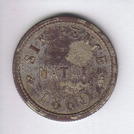 Im Theron sind drei Varianten verzeichnet, die Nr. 1 weicht von dem gezeigten Stück ab, die Punkte unter dem D sind näher am Strich und die Oberkante des Worts NATAL liegt in einer Linie zwischen den Buchstaben S und E von Six Pence. Die Nrn. 2 und 3 sind nicht gerändelt, sondern haben einen glatten Rand. Leider gibts von dem Typ kein Foto. - Ich frage deshalb, weil Theron schreibt, daß diese Stücke, die zunächst in einem Billiardclub als Wechselgeld verwendet wurden, im Geldumlauf der Kolonie aufgingen. Da könnte sich doch auch ein zeitgenössischer Fälscher versucht haben... (was das Stück ja keineswegs uninteressanter macht.)