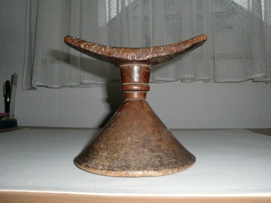 Es handelt sich um eine Schlafstütze, wie sie von somalischen Beduinenvölkern benutzt wurden. Diese sind im heutigen Somalia, dem nördlichen Kenia und dem südlichen Äthiopien angesiedelt. Ich möchte nicht ausschließen, daß solche Teile hier und da immer noch Verwendung finden. Vor allem die somalischen Herren sind sehr eitel und möchten Ihren Kopfschmuck während der Nacht nicht dadurch zerstören, daß sie ihr Haupt mit der aufwändig gestylten Haarpracht auf ein Kissen oder sogar auf den blanken Grund legen. Deshalb wurden solche Nackenstützen entwickelt, an die man sich sicherlich gewöhnen muß. Aber immerhin bleibt die Frisur korrekt. Ausprobiert habe ich das Ding noch nicht…