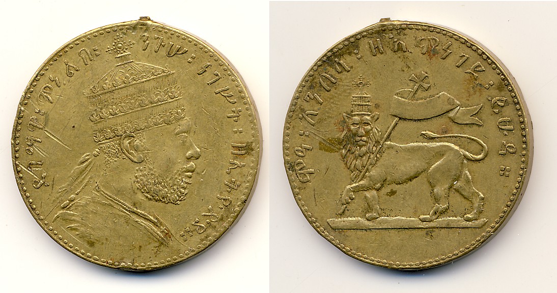 1. eine Medaille aus Messing von Kaiser Menelik II (Gill #M36). Der offizielle Anlass zur Ausgabe der Medaille ist laut Gill unbekannt. Der Henkel ist leider “abmontiert“.