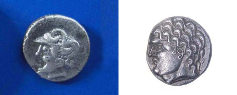 Der Avers stammt aus abgenütztem Stempel. Es sind die schwachen Umrisse eines behelmten (Atnena?)- Kopfes erkennbar.
