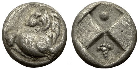 Rv.: Viergeteiltes Incusum, darin Kugel und Weintraube.