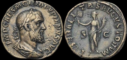 Obv. IMP CAES M CLOD PVPIENVS AVG, laureate, draped and cuirassed bust right