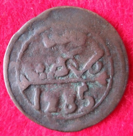 1209 - 1212 war Moulay al-Hossein Thronprätendant und Sultan von Marrakesch, das zu dieser Zeit keine Münzen für den König Moulay Sliman prägte. Von den seltenen Kupfermünzen dieses Herrschers habe ich leider keine Durchmesserangaben zur Hand. Gewichtsmäßig müsste es sich um ein Stück zu 1 1/2 Falus handeln. Nur: So ein Stück ist nicht bekannt ...