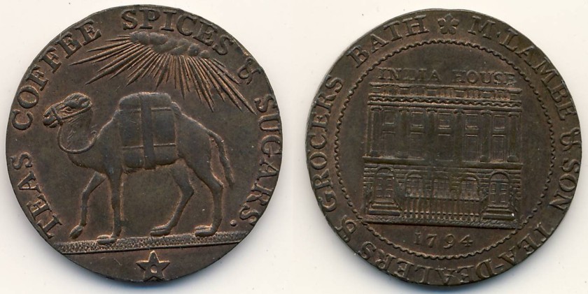 Dieser Token ist ein ernsthafter Token, demzufolge in guter Erhaltung (und das ist er) nicht ganz häufig. Das Kamel als Darstellung ist natürlich attraktiv, das hebt leider den Preis. Der Händler Lambe& Co in Bath saß ja in einem Luxus-Bad, da konnte man das Exklusivste teuer verkaufen. India-House verweist darauf, daß dazumal der Teehandel noch dem Monopol der East India Co. unterlag. (Wie die Beziehungen von Lambe & Co. zu der E.I.C. aussahen, müßte an mal recherchieren.) Tee kam ausschließlich aus China, der Anbau in Indien begann erst eine gute Generation später. Kaffee wurde damals oft von der arabischen Halbinsel bezogen (Mokka), dort landeten auch Schiffe der E.I.C., da dürfte das Kamel eher hinpassen. - Sofern die Randinschrift PAYABLE BY WILLIAM LAMBE & SON lautet, handelt es sich um D&H Somerset 50. Grüße, KarlAntonMartini