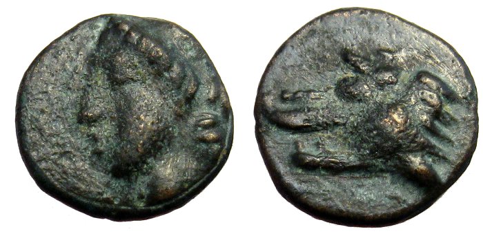 (I) agree with Alan Walker that the coin is more likely to belong to Asia Minor than to Argos. I say this not because I have seen any examples in Turkish museums (Fethiye, Afyon and Bolvadin museums are the only ones in which I have catalogued), but because (i) I have noticed such coins or similar on Ebay in accompaniment with other bronzes from north-west Asia Minor; (ii) the crown on the female head is similar to that on bronzes of Zeleia; and (iii) the head of a wolf (or is it a bear?) is similar to the lion-head on the lion-head/corn-grain bronzes of the Thracian Chersonese, and to the head of a wolf or dog on the obverse of a coin in my own collection, which has as reverse type a monogram (in an olive-wreath) easily resolvable as LY(simacheia). Not of course conclusive, but cumulatively suggestive.