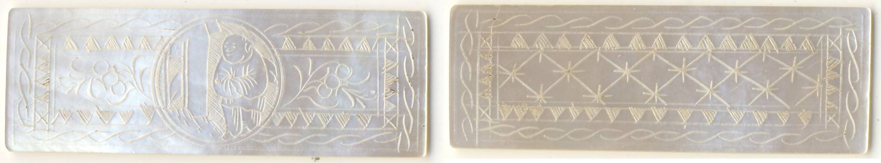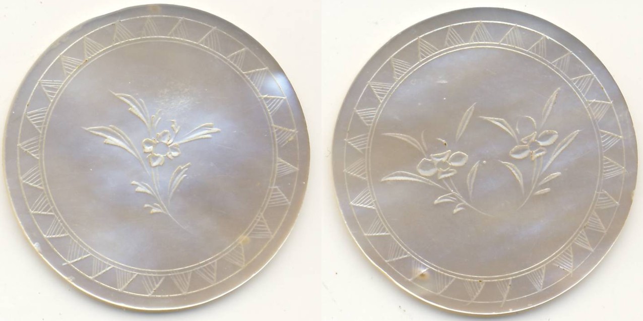 Es wurden hier und im deutschen Forum schon des öfteren in Ostasien hergestellte Spielmarken aus Perlmutt vorgestellt. Früher nahm man an, dass sie in den chinesischen Hongs in Thailand und anderen Ländern Ostasiens als Spielmarken benutzt wurden. Irgendwann aber tauchten die ersten Stücke in England und sonstwo auf der Insel Großbritannien auf. Sei es dass es doch echte chinesische Stücke gab, oder sei es dass sie einfach als touristische Souvenirs mitgebracht worden waren, sie waren bei den kleineren und größeren Lords schnell sehr beliebt, so dass umgehend für Nachschub gesorgt wurde. Irgendwann gehörte es geradezu zum guten Ton der oberen Schichten chinesische Spielmarken im Salon oder im Billardzimmer zu haben. Die meisten Stücke, die man sieht, machen denn auch den Eindruck, dass sie flüchtig in der Massenproduktion hergestellt wurden. Angesichts dieser Tatsache ist die heute gängige Meinung die, dass diese Stücke nie einen chinesischen Spielsalon gesehen haben und direkt für den britischen Markt hergestellt wurden.