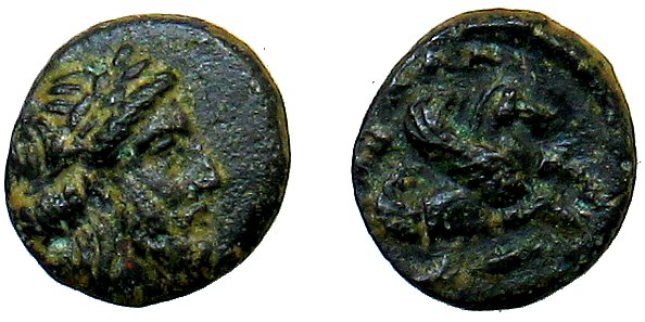 Av.: Kopf des bärtigen Zeus mit Lorbeerkranz im Perlkreis n. re.