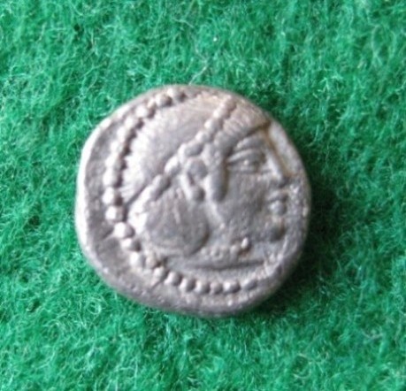 Na, dann will ich das mal ändern - das mit der fehlenden Arethusa. Es ist ein Obol aus Syrakus, aus der Zeit 485/460 v. Chr. Er zeigt auf der Vorderseite den Kopf der Arethusa nach rechts und auf der Rückseite ein 4-speichiges Rad. Auf die Waage bringt er 0,64 gr.