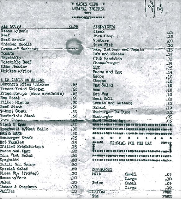 The Oasis Club was definitely the place to hang out! It was well managed, the Army having "Special-Services" personnel back then ... Directly inside was the cashier’s window where one bought "chit-books." ... These "chit-books" had coupons ranging from five-cents to five-dollars I believe. I learned that the Eritrean waiters were not allowed to handle American-money. Black-market I presume.