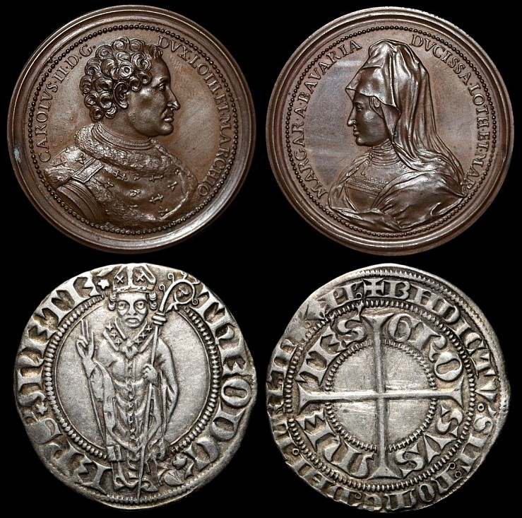 Die Medaillen mit einen Durchmesser von ca. 48 mm zeigen jeweils die Brustbilder von Herzog und Herzogin. Die frühen Portraits sind selbstverständlich fiktiv. Kleidung und Haartracht stimmen nicht immer mit der Epoche überein, in der die Personen lebten. Man kann hier annehmen, daß Saint Urbain durch seine Tätigkeit in Rom und Bologna mit den bekannten italienischen Renaissance-Medaillen vertraut war und sich an ihnen orientierte. Von den Stücken, die ich hier zeigen möchte, trifft das auf die Paare des 14. und 15. Jahrhunderts zu. Die beiden späteren Paare dagegen sind lebensnah gestaltet. Um die Bildfolge etwas aufzulockern habe ich jedem Paar eine zeitgenössische Münze beigefügt, von der man einen Bezug zu Lothringen annehmen darf.