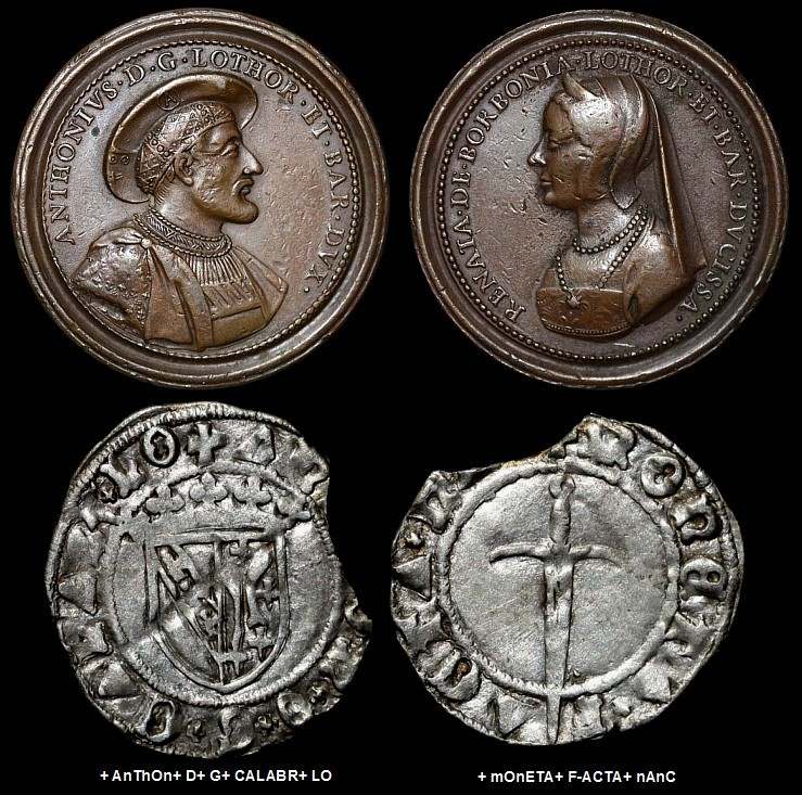 Lorraine Demi Gros non daté. Av. + AnThOn+ D+ G+ CALABR+ LO, geteilter Schild mit den Wappen von Lothringen und Bar unter Herzogskrone. Rv. + mOnETA+ F-ACTA+ nAnC. Senkrecht gestelltes Schwert. Bd.- - S.14 pl. XIV, p. 116 var. - Flon.n° 91 p. 598 var.Anm. zur Abk. CALAB(R). Calabrien in Süditalien wurde mit den Lilien des Hauses Anjou-Neapel ebenso wie das Jerusalem-Kreuz von Lothringen als Anspruchswappen geführt.