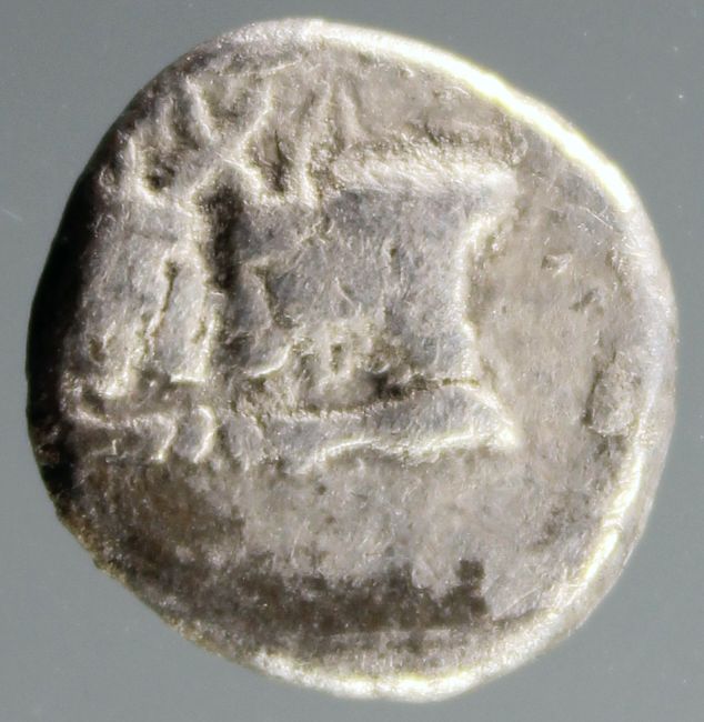 Karien, ungewisse Prägestätte, AR-Triobol, Av.: zwei Stierprotome einander gegenüber, Rv.: Stierprotome n. links in rechtwinkeligem Incuso, ca. 5. Jhdt. v. Chr.; vgl.: Troxell CM 255