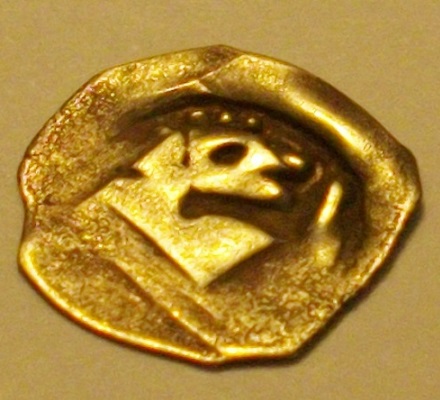 Material dürfte Silber sein, die Maße: 17 mm / 0,64 g. Ich meine, es handelt sich um einen Pfennig aus dem 13./14. Jahrhundert.
