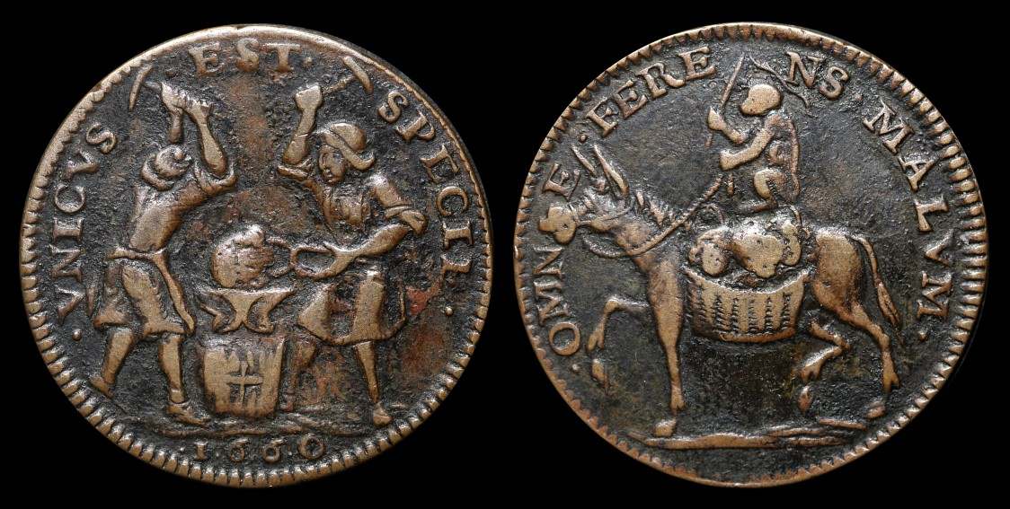 In seinem Metier ist er einzigartig) Exergue 1660. Im Revers schwingt ein Affe die Peitsche und lenkt einen Esel, beladen mit einem Korb, in dem drei weitere Frauenköpfe zu erkennen sind. . OMN - E . - FERE - NS . MALVM . (