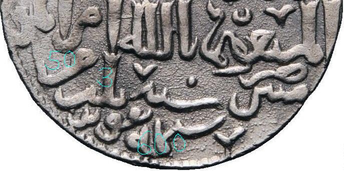 In folgendem Fall (Münzstätte Sivas) erscheinen sowohl die 50 (خمسين (chamsin)) als auch die 1 (احدى (ihda)) als Numeral. Das finale "a" sieht nicht nur ungewöhnlich aus, sondern nimmt auch sehr viel Platz ein.