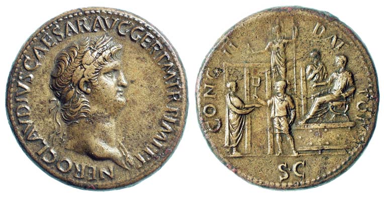 Kommentar: "Nero AE Sestertius. 64-66 AD. NERO CLAVDIVS CAESAR AVG GER P M TR P IMP P P, laureate head right / CONG II DAT POP S-C, Nero, bare-headed & togate, seated left on curule chair on low platform, prefect standing behind him, on ground an attendant standing left distributes coins to a citizen holding out folds of his toga to receive them, Minerva standing before temple in background. BMC 139."