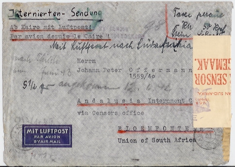 Dateikommentar: Luftpostbrief an einen Internierten in Andalusia. Für kurze Zeit (während des deutsch-italienischen Afrikafeldzuges) war der Postaustausch über Ägypten möglich, sonst über das IRK.