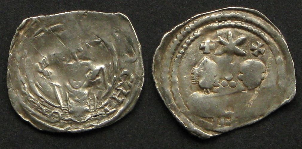 Markgraf von Istrien einen ungekürzten Version eine denar geprägt von Henrik von Andechs-Meranien Inschrift auf der Vorderseite ... ARCHI-OY ..I .. (vielleicht MARCHI-OYSTRIE), wie auf Münze von CNA CJ13 katalogisiert, die Münzen angibt, in Gutenwert geprägt (Otok) von Patriarch Berthold von Aquileia mit seinem Bruder Heinrich IV von Andechs Meranien in den Jahren 1220-1228. (Fig. 1) Zur Umkehr der Flan ist genau, wie die Münze katalogisiert durch CNA CK4 (Pogačnik 110a), geprägten Münzen Rann (Brežice)