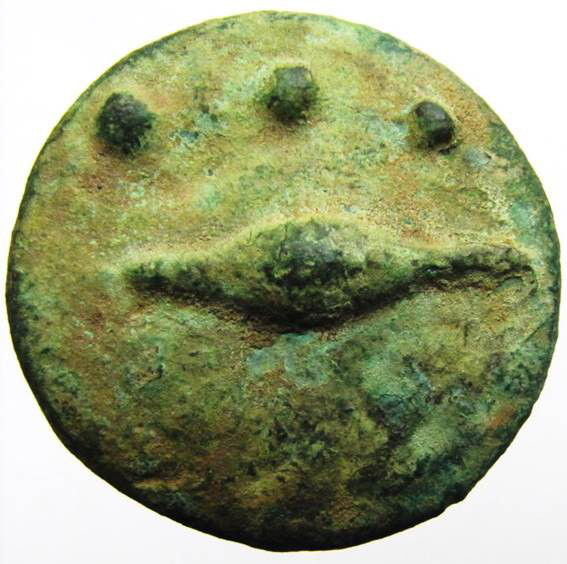 das schöne Stück wiegt 62,5 g und hat einen Durchmesser von 3,6-3,7 cm Ich habe es 2007 in Rom um 50 Euro erworben, ein echtes Schnäppchen, es hat aber einen kleinen Fehler: es ist eine moderne Fälschung! Es ist kein Wunder daß Ihr nicht draufgekommen seid: hier hat man mit diesen Dingen nichts zu tun und kaum jemand hat soetwas schon gesehen. Ich könnte mich jetzt aufspielen und behaupten, ich hätte sofort durchschaut, daß das Stück nicht echt ist und es als Briefbeschwerer erworben, aber die Wahrheit ist: veni, vidi, erravi! d. h., ich bin selbst auch hineingefallen! Die Aes grave Stücke wurden gegossen, mehrere zusammenhängend hintereinander, und dann auseinandergebrochen, so daß die meisten oben und / oder unten ausgebrochen sind. Die Exemplare des römischen Händlers waren aber an den Rändern alle unbeschädigt! Als ich das zweitemal dort war, hatte er eine ganze Schachtel voll davon, wirklich Prachtstücke, große und kleine, auch doppelte!, aber da hatte ich bereits im Internet gesucht... Warum haben die Fälscher geglaubt, sie müßten perfekte Güsse herstellen! Sie haben sich selbst das Geschäft verdorben! Questi sono idioti! Freilich, die Patina ist herrlich! Im Anhang das Bild eines echten Quadrans... sind eher selten...