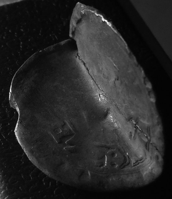 Heute habe ich vorsichtig versucht, die Münze etwas zu biegen - allerdings habe ich nach wenigen Grad damit aufgehört, da ein haarfeiner Riss begonnen hat sich zu verbreitern. Weiterbiegen werde ich also nicht mehr. Ich habe nun versucht durch Veränderung des Beleuchtungswinkels und nachträgliche Kontrastverstärkung Teile des (ziemlich abgegriffenen) Reliefs sichtbar zu machen. Erstmals ist auch ein Blich in die Innenseite möglich.