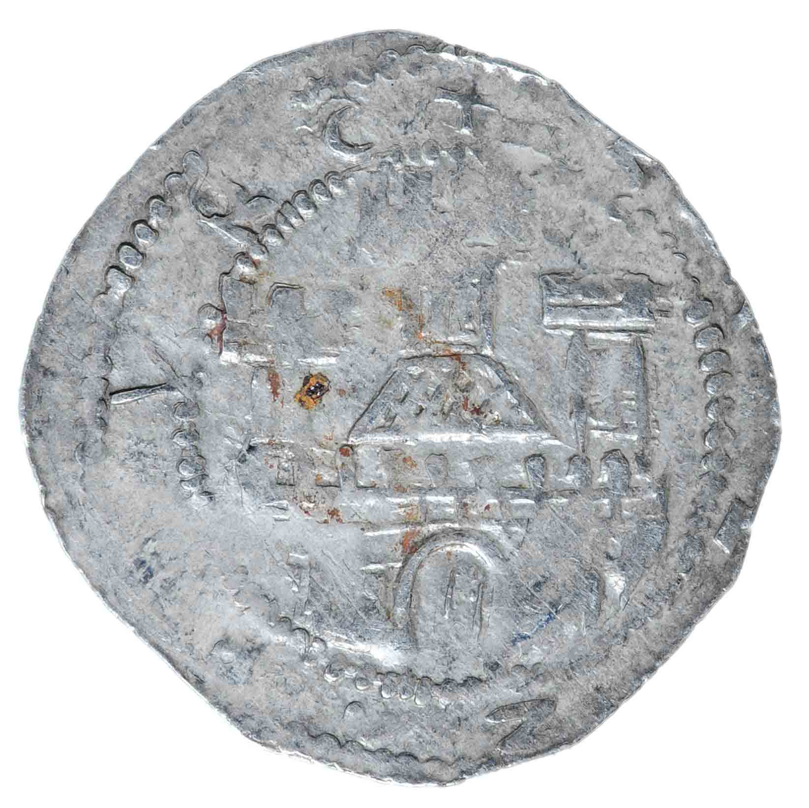 Auf dem Revers ist wiederum ein sehr aufwändig gestaltetes dreiteiliges und mit Zinnen versehenes Wehrgebäude zu beobachten. Bei diesem Stück fehlt allerdings die Umschrift "SALZPURC" zwischen den Perlkreisen. Auch der auf dem Foto zu sehende Strich unter dem Torbogen ist kein Teil von einem "Z".