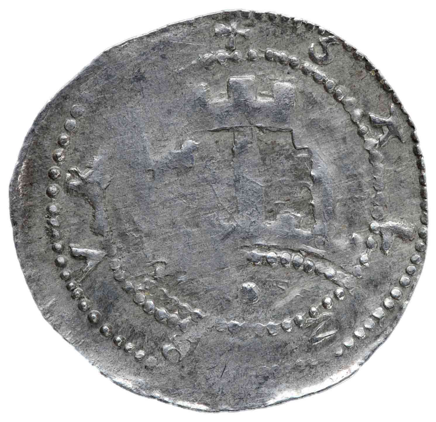 Rückseite mit dreitürmiger Architektur über Mauer mit spitzen Helmen im Faden- und Perlkreis, über den Seitentürmen je eine achtzackige Rosette, Zeichen im Torbogen unkenntlich.