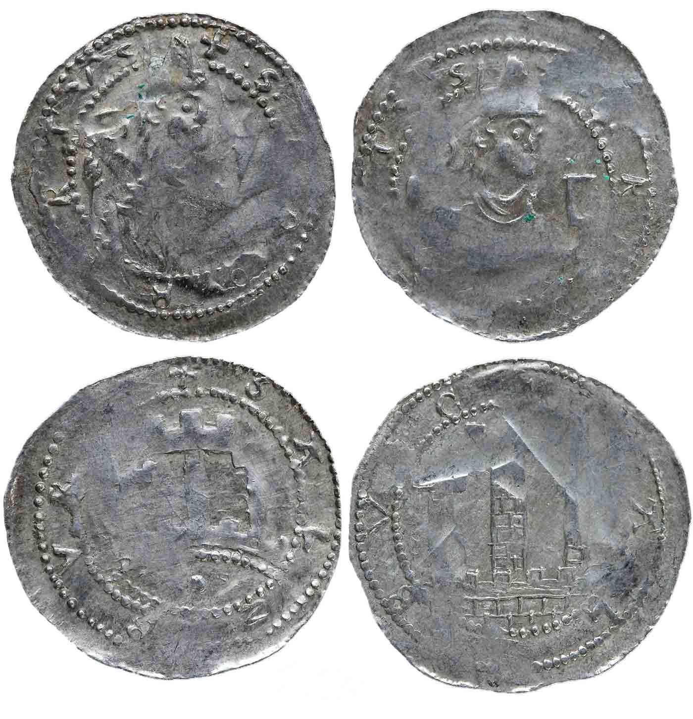 Abschließen möchte ich diesen Leitfaden mit zwei weiteren seltenen Stücke, die anstatt dem dreiteiligen Wohn- oder Kirchengebäude, ein dreiteiliges Wehrgebäude mit zinnenbewehrten Türmen zeigen.