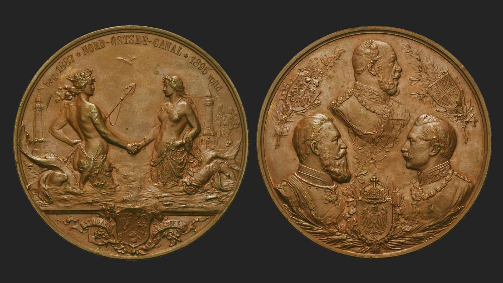 Obv.: Brustbilder Kaiser Wilhelm I., Friedrich III. und Wilhelm II., Vater (1871-1888), Sohn (1888) und Enkel (1888-1918) waren während der Bauzeit des Kanals an der Regierung. Re.: Darstellung der Nord- und Ostsee durch Wassermann und Meerjungfrau, links die personifizierte Nordsee mit Harpune, Auster, Hummer und Taschenkrebs reicht der personifizierten Ostsee die Hand, im Hintergrund links und rechts je ein Leuchtturm. Der linke Leuchtturm steht in Brunsbüttelkoog an der Elbe/ Nordsee, der rechte in Kiel-Holtenau an der Ostsee.