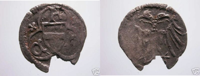 Die mittlere Binde im Wappenschild im Dreipaß ist bei allen mir bekannten Pfennigen dieser Art durchgehend, hier aber hat das Wappen einen abgesetzten Rand.