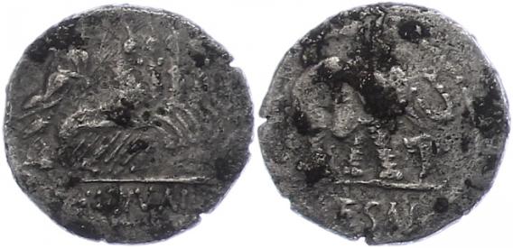 hier habe ich ein interessantes Exemplar, was in einem anderen Forum als Fälschung erkannt wurde. Es handelt sich um einen, in der Antike gefälschten Denar. Erkennt jemand vielleicht die Buchtaben in der Legende auf der Seite mit der Quadriga? Und kann mir jemand sagen, was so eine Fälschung kostet?