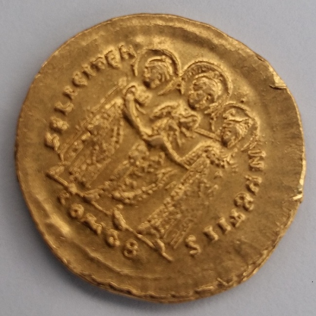 Die Vorderseite scheint dagegen von einem Solidus des Honorius zu stammen, der deutlich früher etwa im Zeitraum von 397 – 402 AD geprägt wurde. DN HONORI – VS PF AVG / Behelmte, gepanzerte Büste mit Diadem, Zepter und reiterverziertem Schild. RIC X, 8.